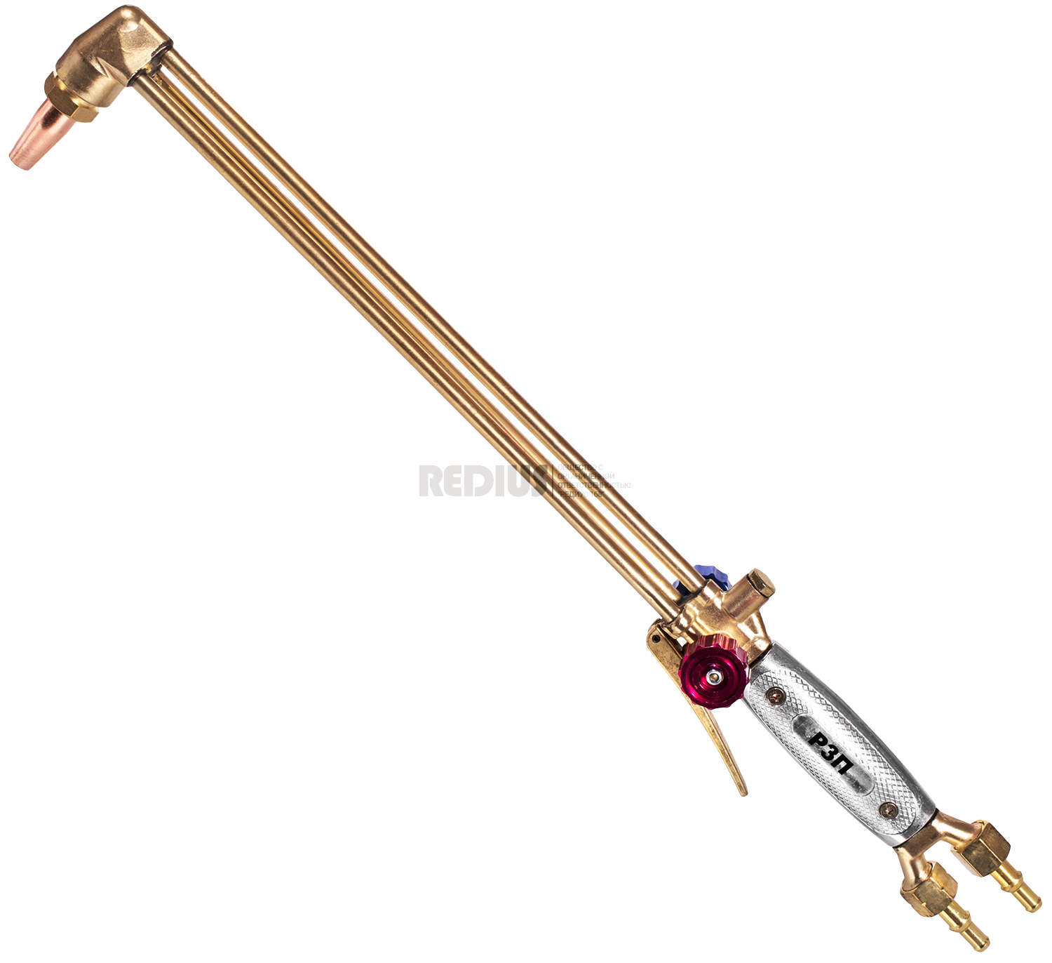 Резак трехтрубный пропано-кислородный с внутрисопловым смешением газов предназначен для резки раскроя и разогрева деталей, заготовок, листового и сортового проката из черных металлов. За счет внутрисоплового смешения газов резаки имеют повышенную стойкость к обратному удару и способны длительное время работать в тяжелых условиях. Резак имеет стандартный мундштук «PNM» и совместим с мундштуками других производителей