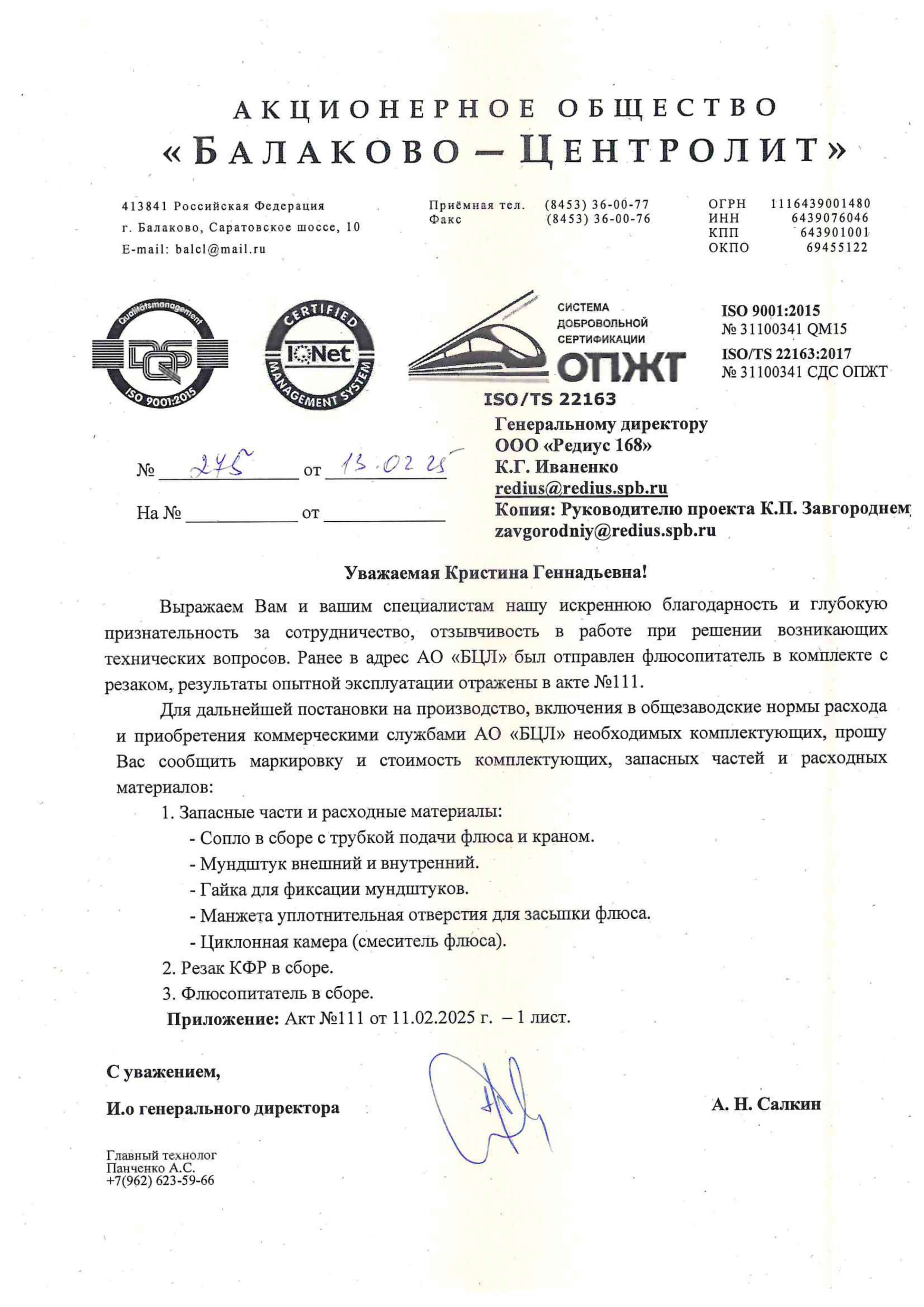 Благодарность от АО "Балаково-Центролит"
