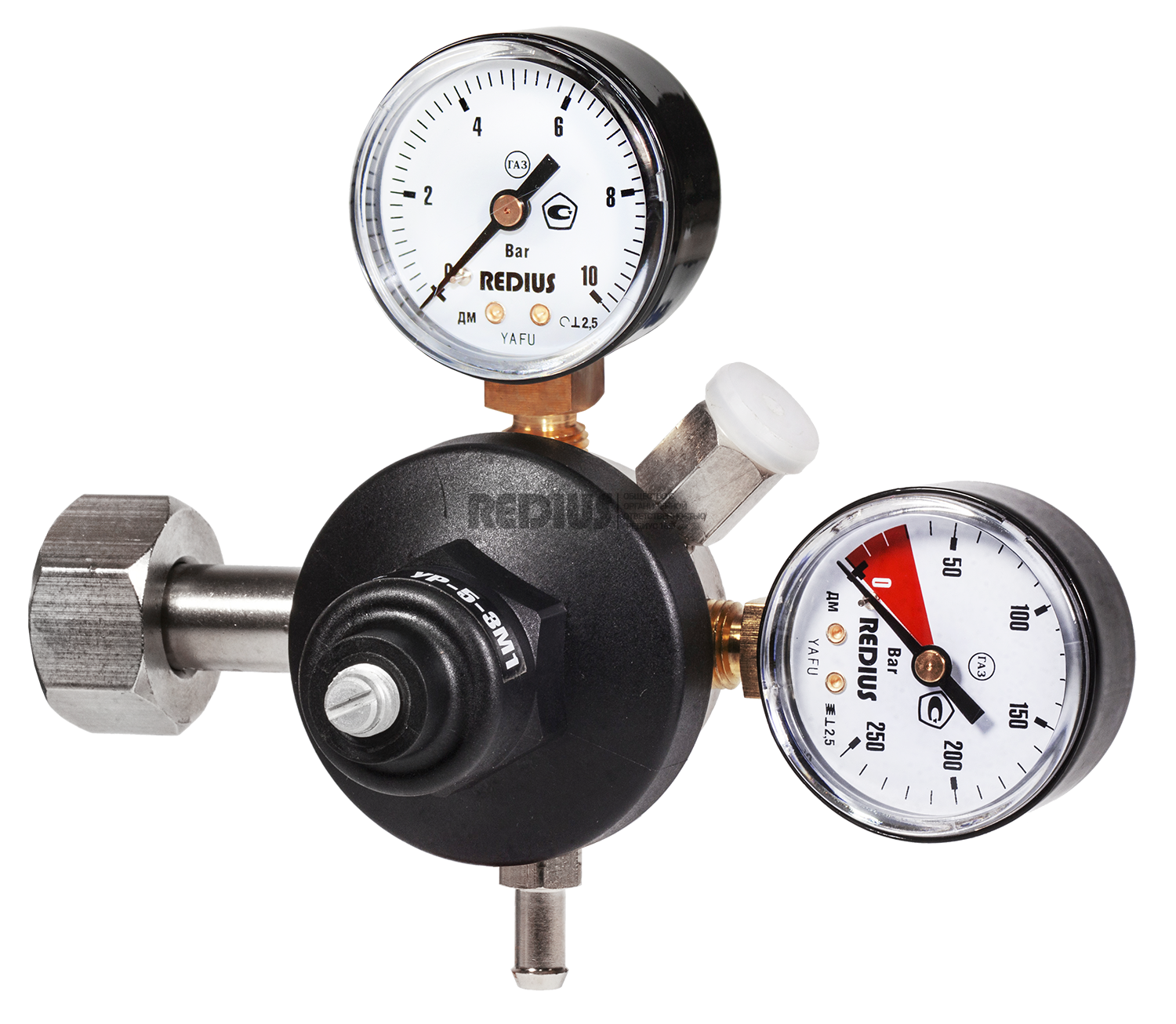 Редуктор высокого давления крупногабаритный для двух газов (углекислота или азот) предназначен для понижения давления газа, поступающего из баллона, и автоматического поддержания постоянного рабочего давления газа на выходе из редуктора, используется преимущественно в процессах розлива газированных напитков.