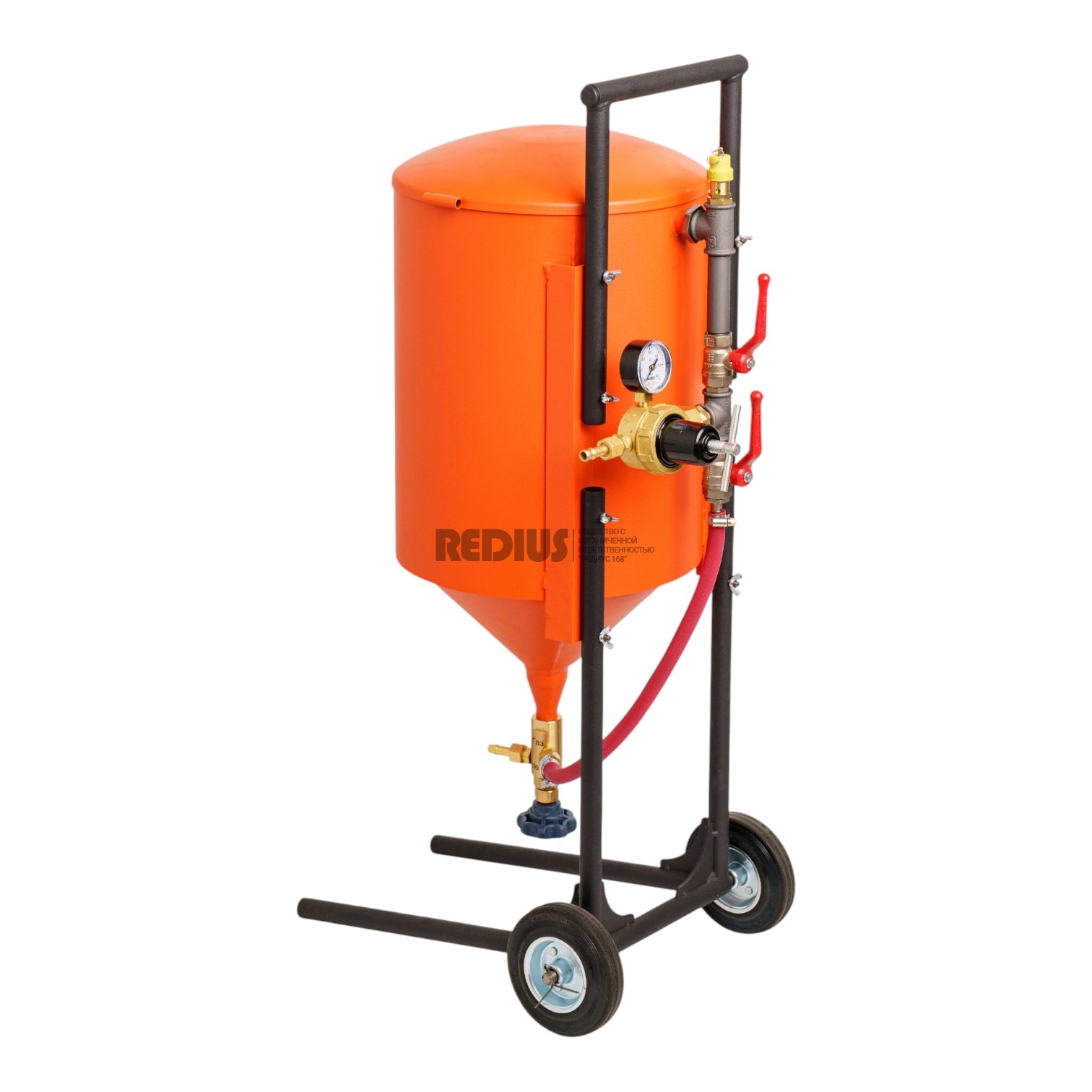 Флюсопитатель – установка, предназначенная для приготовления газофлюсовой смеси и подачи её в резак для кислородно-флюсовой резки различных видов материалов, таких как нержавеющая сталь, чугун, бетон, алюминий и сплавы цветных металлов. В качестве флюсонесущего газа применяется осушенный сжатый воздух или азот. Давление поступающего в установку воздуха регулируется с помощью редуктора, входящего в состав установки. Запуск установки в работу осуществляется открытием шаровых кранов, подающих флюсонесущий газ в бак и циклонную камеру, подача флюса регулируется краном на циклонной камере. Подача смеси в резак осуществляется с помощью резинового рукава Ф=9, входящего в комплект поставки. Загрузка бака флюсом осуществляется через герметично запираемую горловину в верхней части бака. Для удобства загрузки рекомендуется применять воронку с широким горлом.